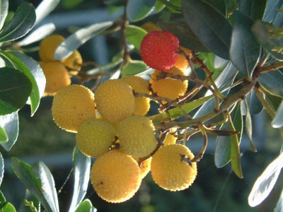 Strawberry Tree. A shrubby evergreen tree with interesting red shedding bark. Small white pink tinged flowers with edible red strawberry like fruits in autumn. hardy. height up to 3m. Sun or shade.